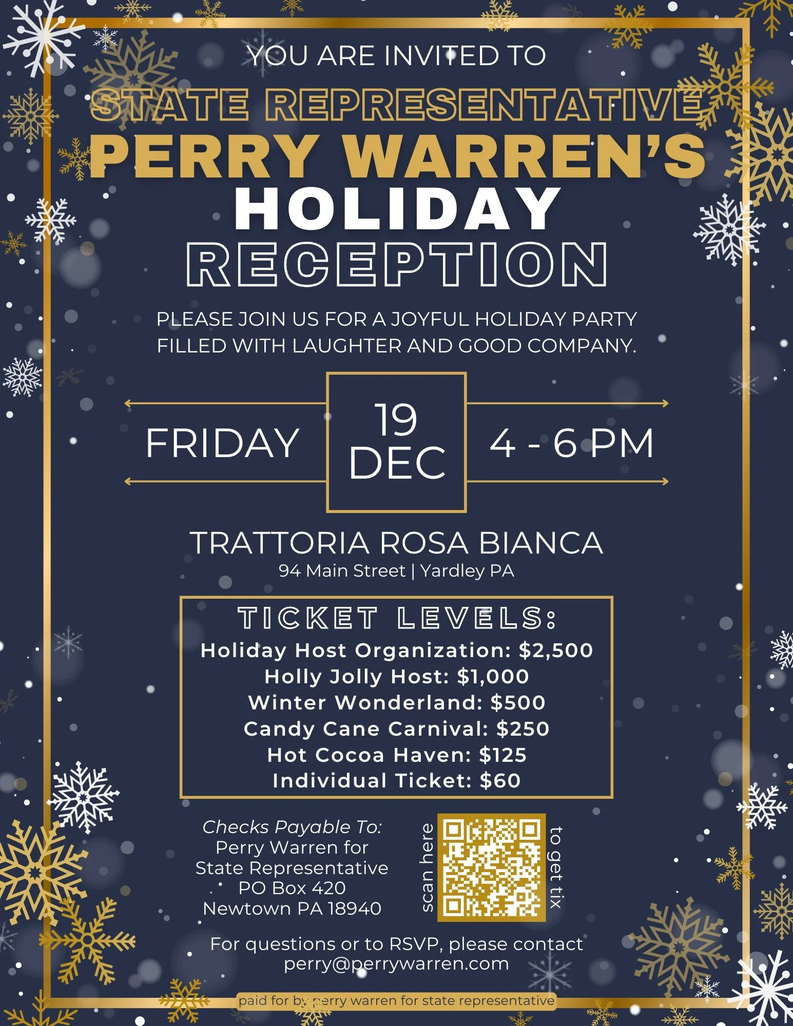 Let’s celebrate the holiday season together! Stop by Rosa Bianca Trattoria on December 10th from 11:30-2:00pm and join us for some holiday cheer and light fare at a reception to re-elect Perry Warren as the State Representative of the 31st District!